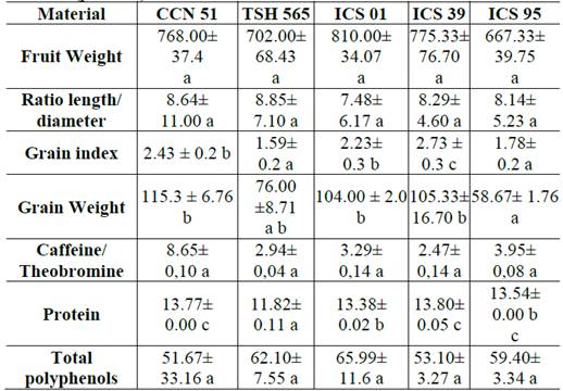 Table 1.: Physical and chemical results of five cacao clones (Theobroma cacao L.) n = 15 ± Standard error; Clones with a common letter are not statistically different (p > 0.05).