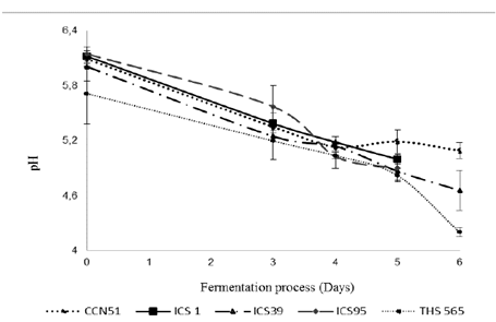 Fig. 1 depicts the behavior of pH throughout microfermentation, which begins with yeast multiplication as they use the sugar contained in the pulp to release ethanol. This is followed by growth and multiplication of lactic acid bacteria and acetobacter that releases lactic and acetic acid, respectively, decreasing pH. These acids migrate toward the inside of the seed penetrating the grain, and initiating the stimulation of enzymatic reactions [21]. The pH values achieved by the ICS 01, ICS95 and CCN51 clones ranged between 4.9-5.09, which are adequate according to recommend stated to obtain good quality cocoa [22-24].