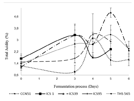 Fig. 2 shows that clone CCN 51, when compared to other clones, had the lowest total acidity percentage with 0.84%. Although the initial acidity is similar for all clones, during the process, each clone shows a different performance depending on the initial total soluble solids, and microbiota profile, among other factors. From Fig. 2 it can be stated that acidity raised until the third day, but after this day, it trends to remain stable. What has shown that during the first days there was the growth of key bacteria for the formation of chocolate flavor precursors, acetic acid formers, oxidation of ethanol and carbon dioxide generating the increase in acidity. Then, all clones ended with acidity between 2.4% and 2.8%, except CCN51, which remained with the lowest acidity (1.6%).