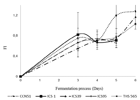 The cocoa beans fermented showed a FI values from 0.65 to 1.27. According to different authors [14,21], FI values within 1 and 1.2 indicates that cocoa beans are sufficiently fermented; higher values are considered over fermented. Therefore, it can be stated that clones ICS 39, TSH 565 and CNN 51 are well-fermentated on the sixth day. This corroborates the results of the daily cut test. Clones ICS 95 and ICS 01, whose fermentation was stopped at day 5, reported FI values lower than 1, which could mean that these clones needed an extra fermentation day.
