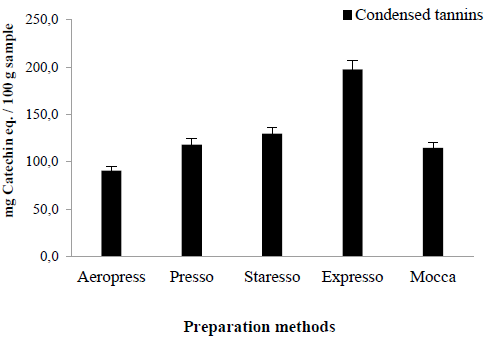 Tannin retention, in the beverages prepared with different pressure filtration methods (Fig. 4), was greatest with the Espresso method, followed by the Staresso and Presso methods: 197.4, 129.5, and 118.1 mg, respectively, expressed as mg of catechin eq./100 g sample. The Moka method had a slightly lower content than that of the Presso method. The Aeropress method registered the lowest tannin content. The statistical analysis indicated a significant difference (p<0.05) between condensed tannin concentration and the beverage’s method of preparation.