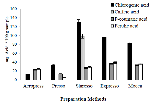Fig. 5 shows the content of hydroxycinnamic acid in the beverages prepared with five different pressure filtration methods. The chlorogenic acid content was highest using the Staresso method, followed by that of the Espresso and Moka methods. Caffeic acid was only detected with the Staresso method. In the Espresso, Moka, Aeropress, and Presso methods, this component was not identified. P-coumaric acid content was greater with the Espresso and Moka methods, followed by the Staresso and Aeropress methods, which presented similar concentrations thereof. The Presso method registered the lowest concentration of p-coumaric acid. Ferulic acid had higher concentrations with the Espresso, Moka, and Staresso methods, and lower content with the Aeropress and Presso methods, in descending order. Only the Staresso method contained all four of the hydroxycinnamic acids evaluated. ANOVA indicated the significant effect (p<0.05) of the preparation method on beverage hydroxycinnamic acid concentration.
