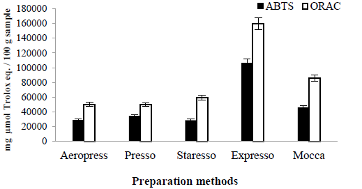 The relationship between the preparation method, cup profile, and antioxidant compound composition has neither been established nor used as an opportunity to offer varieties of coffee with specific sensorial and functional characteristics to the market. Certain previous studies [15,16] did not consider preparation method principle, but instead considered only those which are most popular in coffee shops or homes. In the present study, the preparation method was correlated with that of a variety of chemical antioxidant sorts, including antioxidant capacity. This occured in parallel with the development of an adequate excelso U.G.Q. coffee cup profile, through the preparation of coffee-based beverages prepared with five different pressure filtration methods. The antioxidant metabolites studied here were as follows: total phenols, flavonoids, condensed tannins, and hydroxycinnamic phenolic acids (chlorogenic acid, caffeic acid, p-coumaric acid, and ferulic acid). Antioxidant activity was evaluated by way of the ABTS and ORAC methods.