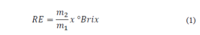 Where m1 is the weight of the toasted, ground coffee in g, m2 is the weight of the total beverage obtained in g, and the °Brix is the beverage’s soluble solids percentage.