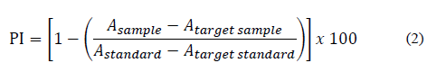 Where, AUCsample is the area below the sample curve, AUCcontrol is the area below the curve for the standard, AUCtrolox is the area below the curve for Trolox, and f is the extract dilution factor.