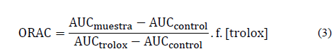 In the ORAC determinations, 6-hidroxi-2,5,7,8-tetrametilchrome-2-carboxilic acid or Trolox (Merck, Germany) was used as standard with controlled temperature conditions, at 37 °C and 7.4 pH. The readings were performed at an excitation wavelength (1) of 493 nm and an excitation opening of five, one excitation emission of 515 nm, emission opening of 13, an attenuator of 1 %, and without attenuating plate. Fluorescein solutions of 1x10-2 M in Phosphate Buffer Solution (PBS) (75 mM), 2.2'-Azinobis (2-amidinopropane) dichlorhydrate (AAPH) 0.6 M in PBS (75 mM) were employed. The beverage samples were prepared with 21 µL of fluorescein, 2.899 µL of PBS, 30 µL of the extract tested, and 50 µL of AAPH. Trolox was used as a standard. The antioxidant protection effect was calculated using the differences between the areas of fluorescein between the target and sample below the decay curve, and the Trolox curve, and was expressed in µmol Trolox/100 g sample and TEAC m, as shown in eq. 3 [24]. Said tests were performed in triplicate. The decrease in fluorescein intensity was made in a spectrofluroimeter (Perkin-Elmer LS-55, Beaconstield, UK). The fluorescein, PBS, sodium phosphate acid and the AAPH were acquired from the Aldrich Chem. Co trading house (Milwaukee, WI).