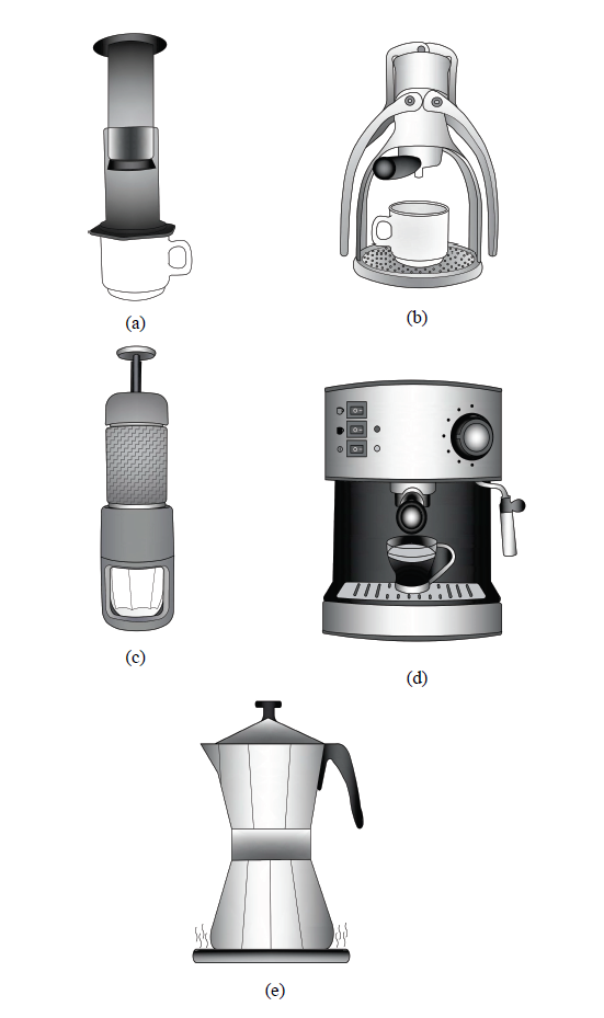 Figure 1: Pressure filtration coffee preparation methods a) Aeropress, b) Presso, c) Staresso, d) Espresso, and e) Moka.