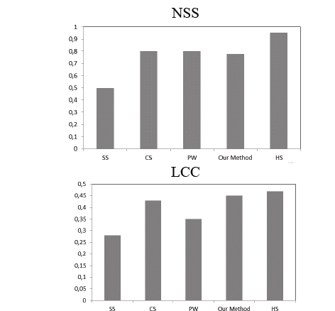 Fig. 10 shows NSS and LCC metrics, and also confirms that the performance of our method is similar to CS and PW, and outperforms SS, but HS outperforms all methods presented.