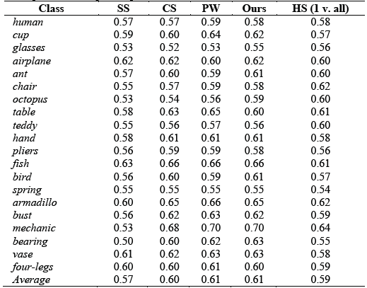 Table 1 shows the AUC score values of the selected methods; our method competes with the CS and PW methods, as the final average shows. The SS method performs poorly compared to our method and the CS and PW methods. The same is true regarding the HS method which outperforms the SS method. Table 1 shows that for the classes glasses, ant, octopus, bird and bearing, our method obtained the best results, while for the classes hand, fish, spring, mechanic, airplane and vase, our method equals the PW and CS methods. The above shows that the proposed method achieves the same as the most up-to-date methods of the literature review and, in some cases, even improves on them.