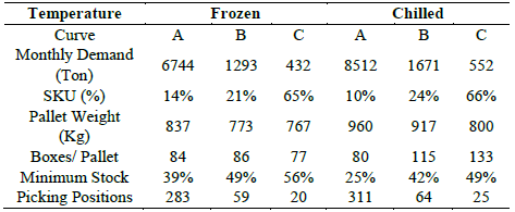 The analysis of the sales for three months and an ABC classification for each temperature was made. This aggregation was chosen to group articles with similar variability of demand and supply. As a consequence, this case study will treat the problem in a simplified way, with six products, three frozen and three chilled.
