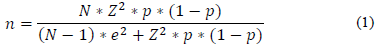 The minimum number of samples (n) is calculated, as shown in Equation 1, using the size of the population (N); failure probability of the analyzed event (p); margin of error (e); and reliability (Z value derived from the normal distribution).