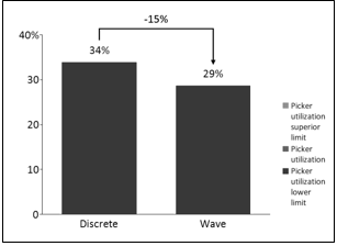 On the other hand, Graph 4, of picker utilization, shows a 15% reduction in the need for the resource picker, which shows that there is a room for improvement in wave picking alternative. Further researches testing this scenario of resource pooling and optimizing the number of requests in each wave may be more conclusive about the change in picking policy.