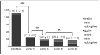 First, Wave picking shows a better result between the scenarios of 76% to 46% of vehicles checked. Secondly, it does not help the system reduce the number of vehicles checked more than 46%, because we end up overloading loaders and having almost no impact on the total average waiting time.