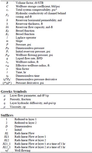 Very few works are found for determining fluid flow behind the casing using transient pressure analysis. [5] presented some numerical simulation results to monitor flow behind the casing using the pressure derivative versus the time log-log plot. They did not quantify the amount of flow between the layers. [7] presented an excellent analytical model to quantify flow behind the casing and measure well-flowing pressure in each layer. Later, [8] used the model introduced by [7] to present some pressure derivative behavior and establish the effect of flow capacity contrast on the pressure derivative behavior in both layers. He also provided two field examples in which interpretation was performed by non-linear regression analysis.