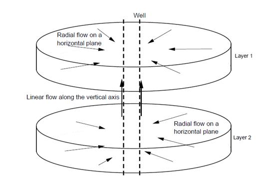This combination of the radial and linear flow regime, called here radi-linear (RL) flow regime, has a non-zero slope on the late-time of the pressure-derivative curve. The inclination of the slope is positive when flow leaves the layer and negative when the flow enters or feeds the layer.