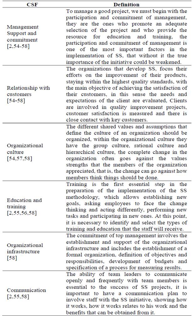 Due to this, one of the objectives of this review was to present the most suggestive CSFs for consideration in the development of the SS strategy in organizations. In this way and reflecting on the various non-consensual opinions of experts in the area it is suggested that those who seek the continuous improvement of their administrative, production or manufacturing processes take into account the factors reported in this literature review. Particularly it is concluded that the recommended CSFs to examine when planning SS project execution are: Management Support and Commitment, Relationship with Clients, Organizational Culture, Education and Training, Organizational Infrastructure and Communication. While it is true, the success of strategy deployment cannot be guaranteed with the sole fact of considering CSFs, it is proven that better organizational results can be achieved in various areas that lead to continuous improvement.