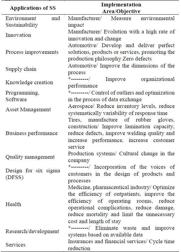 Through the literature reviewed for this research, it can be seen that the applications of SS have been diversified through time. SS initially developed with the firm objective of reducing manufacturing defects in a specific production process. Over time and the various benefits that have been achieved with SS, the organizations not only deploy the strategy with that particular vision, now the administrators of the organizations have decided to implement SS in various areas as they achieve more substantial benefits. In this regard, the administrative part of an organization benefits since it achieves better performance in its own processes, which leads to continuous improvement, saving of resources and the correct administration of them.