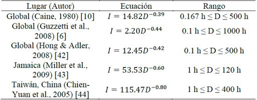 Tabla 4.: Ecuaciones potenciales de umbrales de lluvia a nivel global y para sitios específicos.