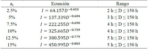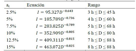 Las ecuaciones potenciales obtenidas de ajustar las condiciones I-D que alcanzaron los porcentajes de área crítica de falla (ac) de la Fig. 5 se presentan en la Tabla 5. Estas ecuaciones mostraron un aumento en la pendiente β (en la gráfica a escala logarítmica) y en la intersección (asociada al parámetro α) con el eje de las intensidades a medida que aumenta ac.