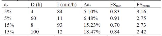 En la Tabla 7 se presentan los porcentajes de área de falla (Δaf) generados por los eventos de lluvia descritos, así como el factor de seguridad mínimo (FSmín) y el factor de seguridad promedio (FSprom) obtenidos para todas las celdas de la subcuenca. Es de destacar que los escenarios de corta duración y alta intensidad presentaron zonas que predicen deslizamientos y que no fallan en los eventos de larga duración.