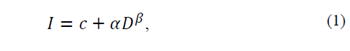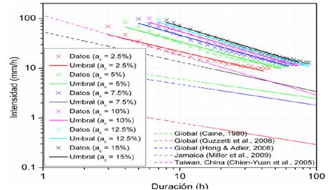 donde I es la intensidad promedio de la lluvia, D la duración de este evento, α un parámetro de la escala (intercepto), β un parámetro de forma que define la pendiente de la curva potencial y c como una constante de ajuste del intercepto (generalmente c = 0). Puesto que la mayoría de umbrales de lluvia son representados por una ley potencial, se puede creer que hay invariancia en la escala para las condiciones de lluvia que inducen la ocurrencia de deslizamientos, aunque no se conoce con precisión las razones del comportamiento de escala de este fenómeno. De acuerdo a Alvioli et al. (2014) [12], las condiciones de lluvia que resultan en laderas inestables coinciden con umbrales I-D para la posible ocurrencia de deslizamientos.