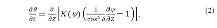 donde Z es la profundidad bajo la superficie del terreno (dirección de la coordenada vertical, positiva hacia abajo), δ es el ángulo del talud, ψ es la cabeza de presión, K(ψ) es la función de la conductividad hidráulica, θ es el contenido volumétrico de agua y t es el tiempo.