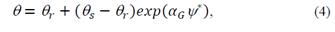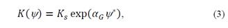 donde K s es la conductividad hidráulica saturada, ψ* = ψ - ψ 0 , con ψ 0 como una constante (se asume ψ 0 = -1/α G); θ r es el contenido volumétrico de agua residual, θ s el contenido volumétrico de agua en saturación y α G es la inversa de la cabeza de entrada de aire o inversa de la altura del ascenso capilar sobre el nivel freático [15].