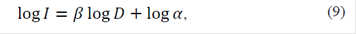 de modo que la gráfica de log I contra log D da una línea recta con pendiente β e intersección con el eje de las ordenadas en log α. Los parámetros α y β se evalúan mediante una regresión lineal por mínimos cuadrados, permitiendo volver a la ecuación potencial (ec. 1) para la predicción de umbrales de lluvia que desencadenan deslizamientos.