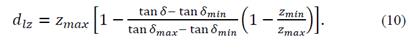 En el modelo TRIGRS el espesor del suelo representa la profundidad del suelo donde se observa un cambio significativo de las propiedades hidráulicas [37], por lo cual se constituye en la superficie deslizante (d lz ). Este espesor se estima generalmente mediante metodologías que relacionan el ángulo de la pendiente (δ), sus valores máximos y mínimos (δ max y δ min ) dentro de un área de estudio y con valores máximos y mínimos del espesor del suelo efectivo (z max y z min ) en dicha área. El modelo S, propuesto por Saulnier et al. (1997) [38], define el espesor del suelo (d lz ) como se muestra en la ec.(10).
