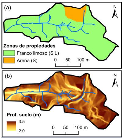 Figura 2. : Insumos del modelo TRIGRS. (a) Zonas de propiedades geotécnicas e hidráulicas homogéneas y (b) espesor del estrato superficial del suelo.
