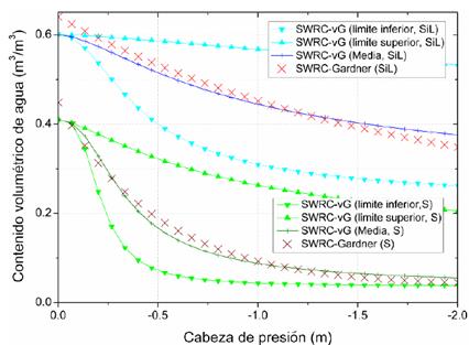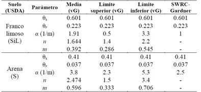En la Fig. 3 se presentan las curvas características de retención de agua del suelo para suelo arenoso (S) y limoso (SiL) con el modelo de van Genuchten, de acuerdo con la clasificación de la taxonomía de suelos USDA. Corresponden a curvas medias y límites inferiores y superiores obtenidas de los valores medios de θ s θ r , utilizando los valores medios y desviaciones estándar de los parámetros θ vG y n, presentados por Hodnett & Tomasella (2002) [40] para ambas clases de textura del suelo (USDA). Asimismo, se muestran curvas características construidas por el modelo de Gardner, para el cual el parámetro α G se ajustó a las otras curvas características, manteniendo los valores de θ s y θ r medios para cada tipo de suelo. La Tabla 3 muestra los parámetros de las curvas características presentadas en la Fig. 3.