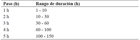 Tabla 1.: Variación de los tamaños de paso de las duraciones para la definición de los umbrales de lluvia