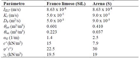 Tabla 2.: Propiedades hidráulicas y mecánicas del material en ambos tipos de suelo.