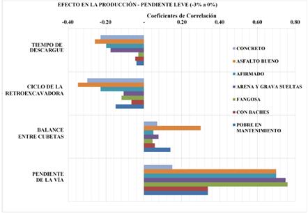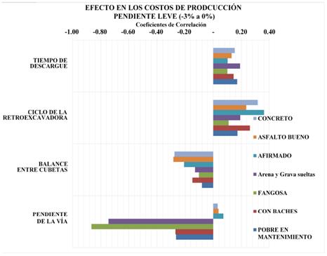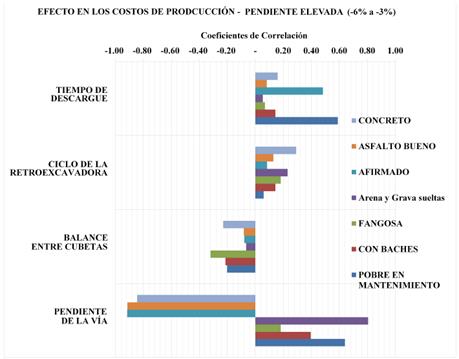 Si la pendiente es elevada, en las superficies con mayor dificultad de tránsito, la incidencia en la variación en los costos de producción es directa, es decir, cuando la pendiente es elevada y los terrenos son de difícil tránsito, si la pendiente aumenta los costos de producción aumentan, y si esta disminuye los costos se reducen, lo contrario ocurre si la pendiente es leve en superficies de buen mantenimiento debido a que se presenta menor resistencia al movimiento, la relación entre este parámetro y los costos de producción son inversos. Cuando las pendientes son leves se evidencia un cambio en el comportamiento de la relación entre la pendiente y los costos de producción, dado a que en pendientes bajas el equipo no requiere utilizar gran parte de su potencia para superar la resistencia por pendiente (que ahora es mucho menor), la mayoría de la potencia disponible se utiliza para superar resistencia al rodamiento que depende principalmente de la condición de la superficie, de aquí que los costos de producción se incrementan con la falta de mantenimientos de la superficie de la vía.