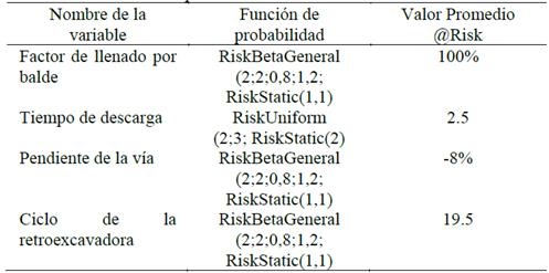 El flujo para ejecutar la SMC inicia en el modelo base de comportamiento e interacción entre las variables de entrada, por lo cual se debe definir el caso de estudio, el cual es un movimiento de tierras tipo arcilla arenosa, peso unitario suelto 1.276 Kg/m3 (2.150 lb/cy), ángulo de reposo 2:1, distancia a recorrer: 4,828 m (5.280 yardas), con retroexcavadora de balde de 2,29 m3 (3 cy) y volquetas de descarga trasera de 22 ton (tipo dumper). Después de definir las variables dependientes e independientes para construcción del modelo, se debe seleccionar o asignar las correlaciones a los factores de riesgo y ajustar los generadores de números aleatorios, número de iteraciones, valores semillas, entre otros criterios para la SMC, al finalizar la definición y crear el modelo estadístico se puede ejecutar las simulaciones [4]. Se definieron las variables de la siguiente manera: