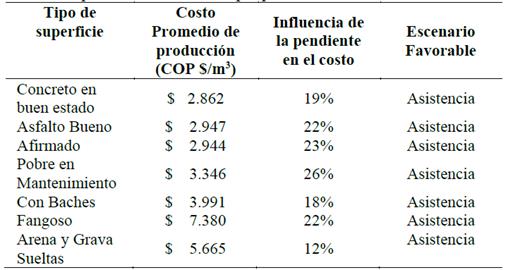 Para el caso de pendientes elevadas, cuando se relaciona la producción volumétrica con los costos de operación se infiere que, en superficies de buen mantenimiento la relación es óptima, mientras que para las superficies de difícil tránsito se presentan producciones volumétricas bajas, lo que implica costos de producción más altos.