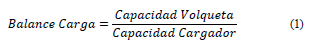 Aun así, una de las consideraciones importantes en el cálculo de la producción en movimiento de tierras es el adecuado emparejamiento con los equipos interrelacionados en la operación, para garantizar la selección de equipos con capacidades compatibles, para que las capacidades combinadas den la máxima eficiencia en toda la operación. Una forma para calcular la producción de las volquetas se basa en el análisis del balance de cargas, mediante la Eq. (1) se describe la relación entre la cantidad de movimientos del cargador que se necesitan para cargar la volqueta.
