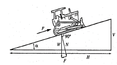 La resistencia por pendiente es el efecto de la fuerza de gravedad sobre el movimiento de la máquina (Fig. 1), su efecto es proporcional a la dirección del viaje. Si el equipo sube una pendiente, la resistencia por pendiente actúa oponiéndose al movimiento, mientras que si el equipo baja la resistencia por pendiente se convierte en asistencia por pendiente. Esta propiedad física no es afectada por la condición superficial del terreno ni del equipo, pero si por la relación angular de la pendiente. A mayor pendiente, mayor es el efecto de la resistencia por pendiente durante la operación del equipo.