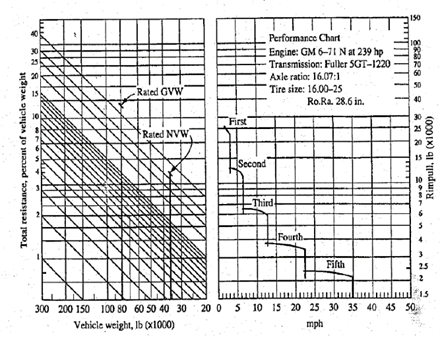 La potencia disponible para operar una máquina es la potencia generada por el motor para poner en funcionamiento el equipo y se mide en caballos de fuerza. Cada fabricante determina la potencia disponible para las máquinas, estableciendo curvas de rendimiento, donde se describe la potencia disponible que está relaciona con la fuerza de tracción, que es la fuerza que interviene en el movimiento de la máquina derivada de fricción entre las ruedas de la máquina y la superficie sobre la que viaja, la resistencia total al rodamiento y el peso del vehículo (Fig. 2). La Fig. 2 presenta un gráfico de rendimiento para una volqueta Caterpillar de 22 toneladas [2], en este tipo de gráfica se puede determinar la velocidad de operación de la volqueta para diferentes condiciones de operación.