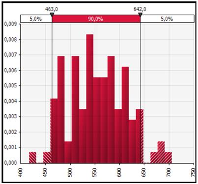 En la Fig. 3 se muestra el comportamiento de la producción de una flota cuya cantidad de volquetas no supera la capacidad de operación del cargador, en función de la probabilidad de ocurrencia en el cual se muestra una probabilidad del 5% de lograr una producción horaria de al menos 491 m3 (642 lcy), una probabilidad del 5% de que la producción sea menor o igual a 354 m3 (463 lcy) y una producción más probable del 405 m3 (530 lcy). Para los análisis de resultados en esta investigación se trabajó con el valor promedio interpretado como las estimaciones de valor más probables en ocurrencia o más frecuentes.
