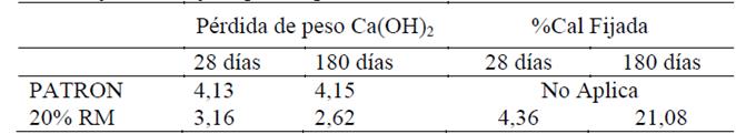 Donde CHc es la cantidad de portlandita en la pasta de control para una edad determinada, CHp es la Cantidad de portlandita en la pasta con la puzolana a la misma edad de la pasta de control y C es la proporción del cemento en la pasta. Los resultados obtenidos de la ecuación 1 se presentan en la Tabla 3. El aumento continuo de pérdida de peso de la pasta PATRON es atribuido a la hidratación de los silicatos de calcio anhidro, contribuyendo a una mayor producción de la portlandita, mientras que la pérdida menor de peso de la pasta 20% RM, son debida a la menor proporción de OPC y por la reacción puzolanica, donde es más notoria en el periodo más largo (180 días de curado).