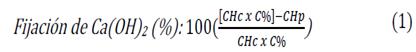 El efecto puzolánico fue analizado a partir del pico 4 de los DTG, mediante la medición del consumo del hidróxido de calcio en la pasta con 20% de RM. Se observa que la mezcla 20% RM presento una menor cantidad de CH en comparación a la mezcla PATRON, este comportamiento se observó a lo largo de todas las edades, confirmando así el carácter puzolánico del RM. La fijación del % de cal se calculó siguiendo la ecuación 1 [36,39].