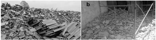 Figura 1: a) elementos no conformes de la industria ladrillera y b) residuo de mampostería.