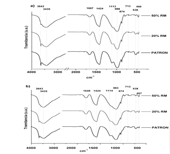 La Fig. 7 muestra los espectros de FTIR a 28 y 360 días de las diferentes mezclas (PATRON, 20% RM y 50% RM) en la región de 4000 cm-1 a 400 cm-1. La banda ancha alrededor de 3432 cm-1 corresponde al agua enlazada en los productos de reacción [30]. La banda a 3643 cm-1 es debido a las especies (OH) de Ca(OH)2 [31]. La banda ubicada en longitudes entre 1640 cm-1 y 1650 cm-1, corresponden a las vibraciones de valencia de grupos O-H del agua ligada a sulfatos presentes en el cementante [32] o el agua molecular absorbida. La banda de carbonatos se observa en 1420-1480 cm-1 y se presenta en las muestras hidratadas inicialmente, surgen de las reacciones del CO2 atmosférico con el hidróxido de calcio o del carbonato presente en el cemento Portland. La banda ubicada en longitudes de onda entre 1100 cm-1 y 1200 cm-1, corresponde a la vibración S-O asociada al SO4. La banda a 874 cm-1 y 713 cm-1 son atribuido a las vibraciones ʋ2 y ʋ4 del CO3 -2 respectivamente [33], la presencia del CaCO3 se atribuye al CO2 absorbido durante la preparación de las muestras, y a la adición calcárea presente en el OPC [34].