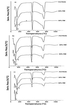 Figura 8: Curvas DTG a diferentes tiempos de hidratación de pastas: a) 3 días, b) 28 días y c) 180 días.