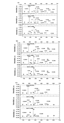 Los difractogramas obtenidos de la mezcla PATRON, 20% RM y 50% RM a los 3, 28 y 360 días de curado se muestran en la Fig. 9. Se observa que todos los patrones de difracción son similares, sin embargo las intensidades son diferentes. Portlandita (CH), etringita (E) y aluminato cálcico hidratado (CAH), son los principales productos de hidratación identificados. También se identificaron otras fases como el silicato tricalcico-Alita (C3S), silicato bicalcico-Belita (C2S), cuarzo (Q), anortita (A) y calcita (C) características de las fases no hidratadas del OPC o fases correspondientes al RM.