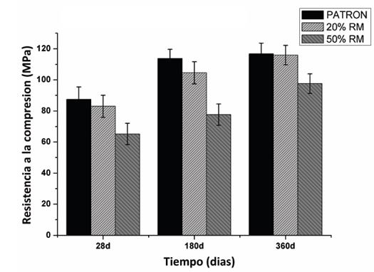 La resistencia a la compresión de las pastas con presencia de RM decrece significativamente a los 28 días de curado. Este decrecimiento en la resistencia en esta edad de curado es debido al predominante efecto dilución, sin embargo, la reactividad puzolanica del RM genera reacciones a largas edades de curado (180 y 360 días), que permiten el desarrollo de nuevos productos de reacción, que generan mayores ganancias de resistencia en comparación a la pasta PATRON.
