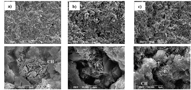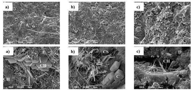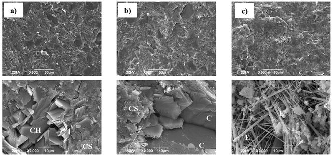 Figura 12: Imágenes SEM de: (a) PATRON, (b) 20% RM and (c) 50% RM a 28 días de curado.