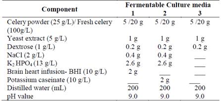The fermentable media was mainly composed of 10% w/v celery, yeast extract 5 g/L, and dextrose 1 g/L. But, they were either enriched with BHI 10 g/L, potassium caseinate 10 g/L, NaCl 2 g/L, K2 HPO4 13 g/L. The addition of those compounds to the media varied as shown in the Table 1. Consequently, three different media compositions were evaluated.