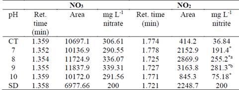 Table 2.: Peaks area of nitrate and nitrite obtained on running chromatograms from samples at different pHs.